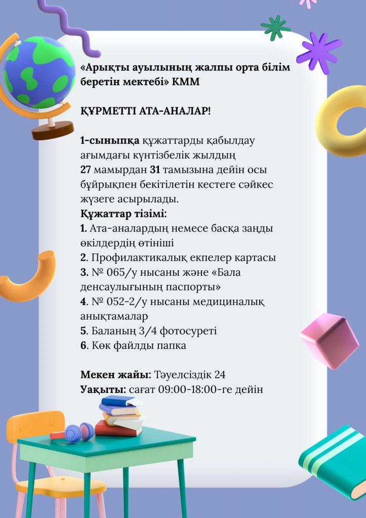 «Арықты ауылының жалпы білім беретін мектебі» КММ 1-сыныпқа құжаттар қабылдаудың басталғанын хабарлайды.